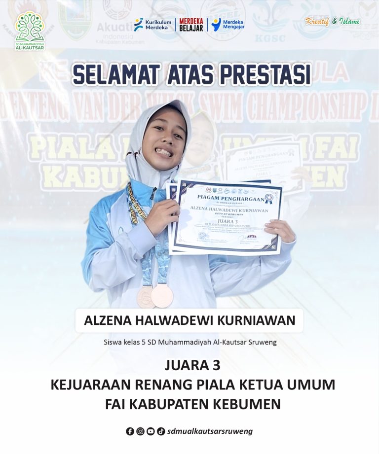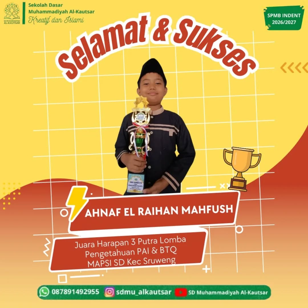 Satu lagi prestasi membanggakan berhasil diukir oleh siswa SD Muhammadiyah Al-Kautsar. Ananda Ahnaf El Raihan Mahfush sukses meraih Juara Harapan 3 dalam cabang Lomba Pengetahuan Pendidikan Agama Islam (PAI) dan Baca Tulis Al-Qur’an (BTQ) Putra pada ajang Lomba MAPSI (Mata Pelajaran Pendidikan Agama Islam dan Seni Islami) tingkat Sekolah Dasar se-Kecamatan Sruweng.