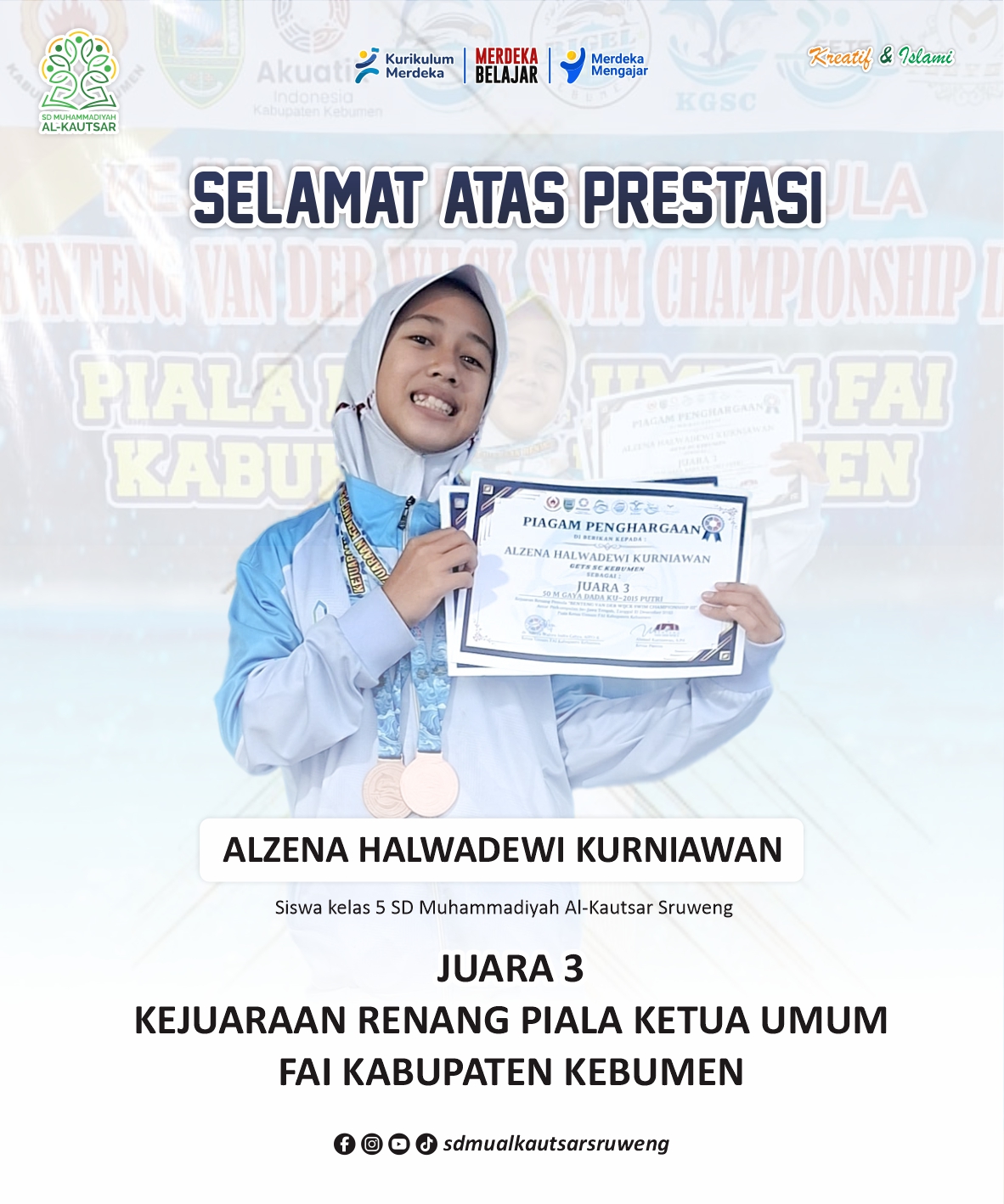 SD Muhammadiyah Al-Kautsar Sruweng kembali menorehkan prestasi yang membanggakan. Kali ini, kabar gembira datang dari cabang olahraga renang. Salah satu siswi terbaik kami, Alzena Halwadewi Kurniawan, siswi kelas 5, berhasil meraih Juara 3 Kejuaraan Renang Piala Ketua Umum FAI Kabupaten Kebumen.